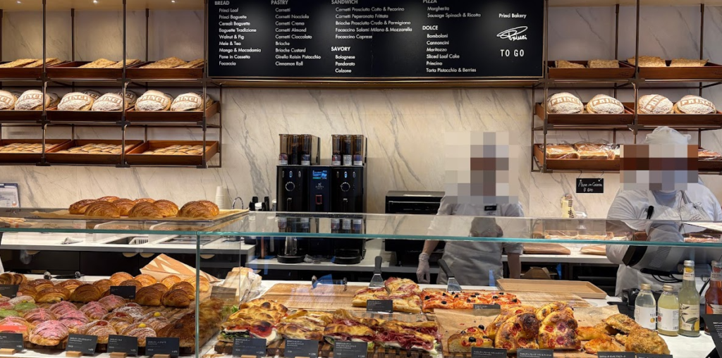 ミラノ発のベーカリーブランド「PRINCI(プリンチ)」が入っていて、焼きたてのパンやフォカッチャが並び、店内には香ばしい香りが広がっています。