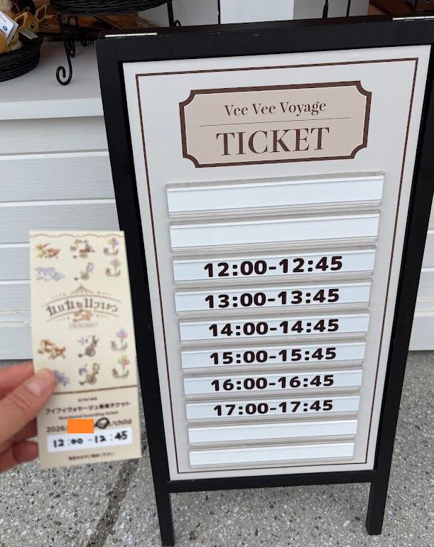 チケットワゴンはアトラクションのすぐ近くにあり、写真のような時間指定のボードが目印です。